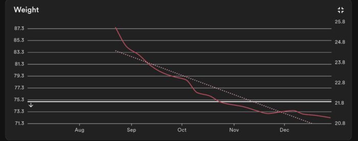 The starting point was ~87 kg, by changing diet and food preferences I’ve doubled the target with current weight of ~72kg